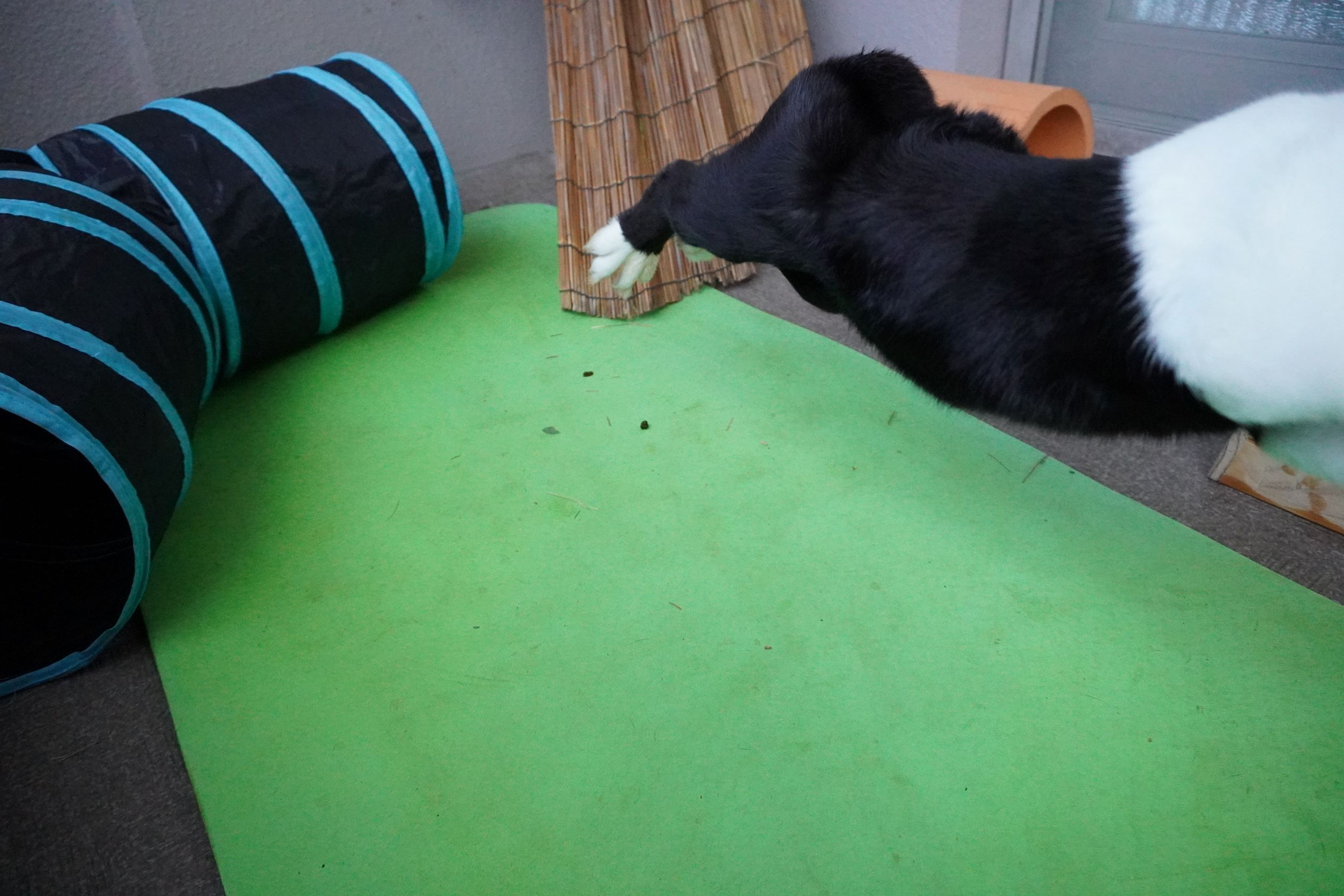 ビスケ君、初めて見る大きい葉っぱに、おっかなびっくり
